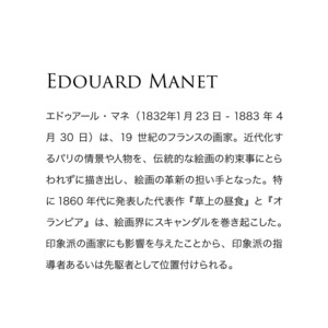 【エドゥアール・マネ】(1832年1月23日 - 1883年4月30日)は、19世紀のフランスの画家。近代化するパリの情景や人物を、伝統的な絵画の約束事にとらわれずに描き出し、絵画の革新の担い手となった。特に1860年代に発表した代表作『草上の昼食』と『オランピア』は、絵画界にスキャンダルを巻き起こした。印象派の画家にも影響を与えたことから、印象派の指導者あるいは先駆者として位置付けられる。